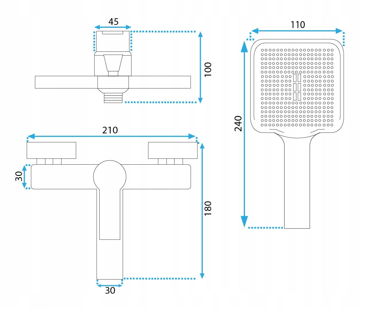 - Zawartość zestawu: wylewka, bateria, wąż prysznicowy, słuchawka prysznicowa, mocowanie ścienne słuchawki