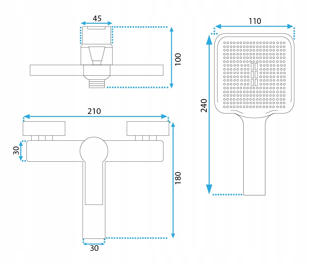 - Zawartość zestawu: wylewka, bateria, wąż prysznicowy, słuchawka prysznicowa, mocowanie ścienne słuchawki