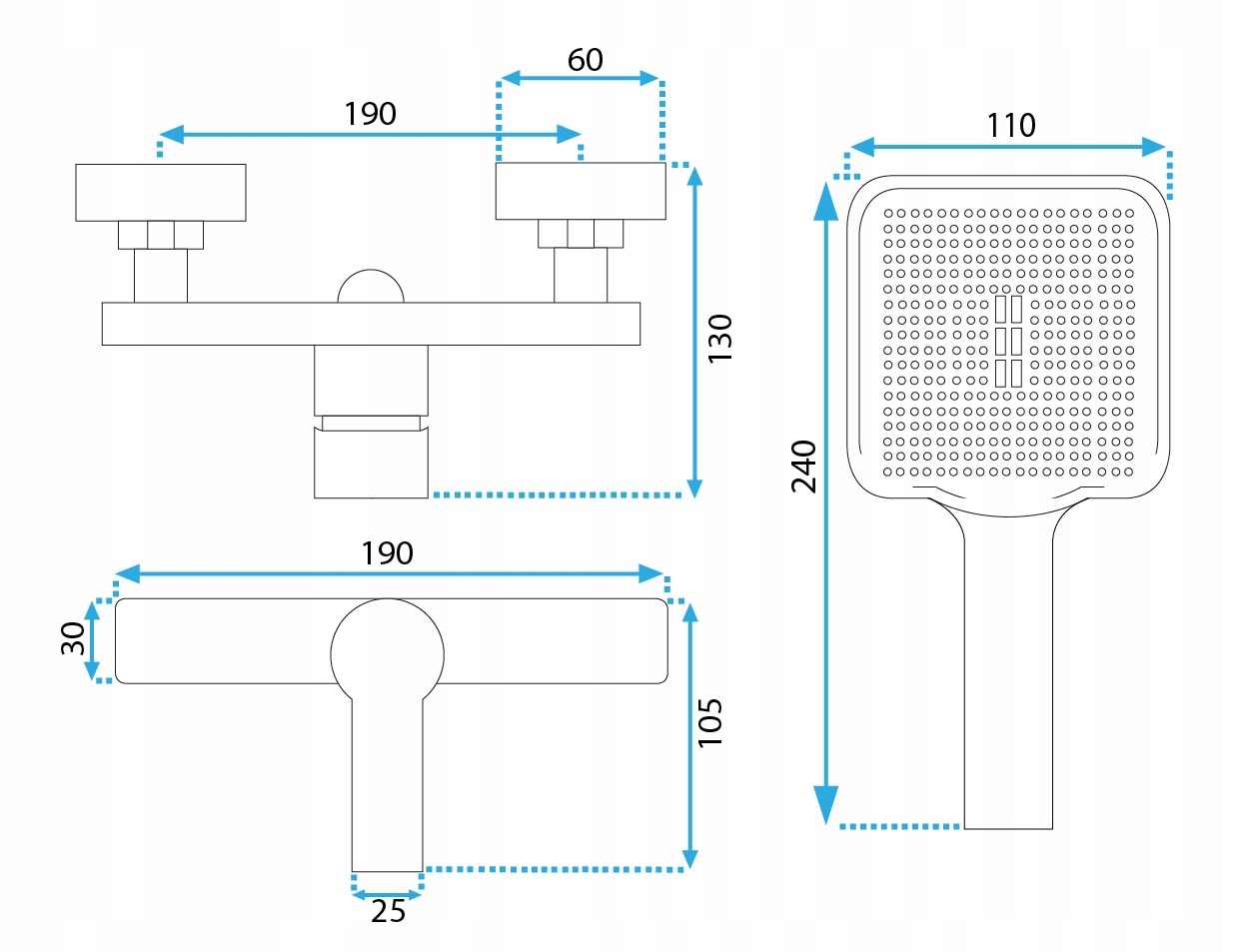 - Zawartość zestawu: bateria, wąż prysznicowy, słuchawka prysznicowa, mocowanie ścienne słuchawki