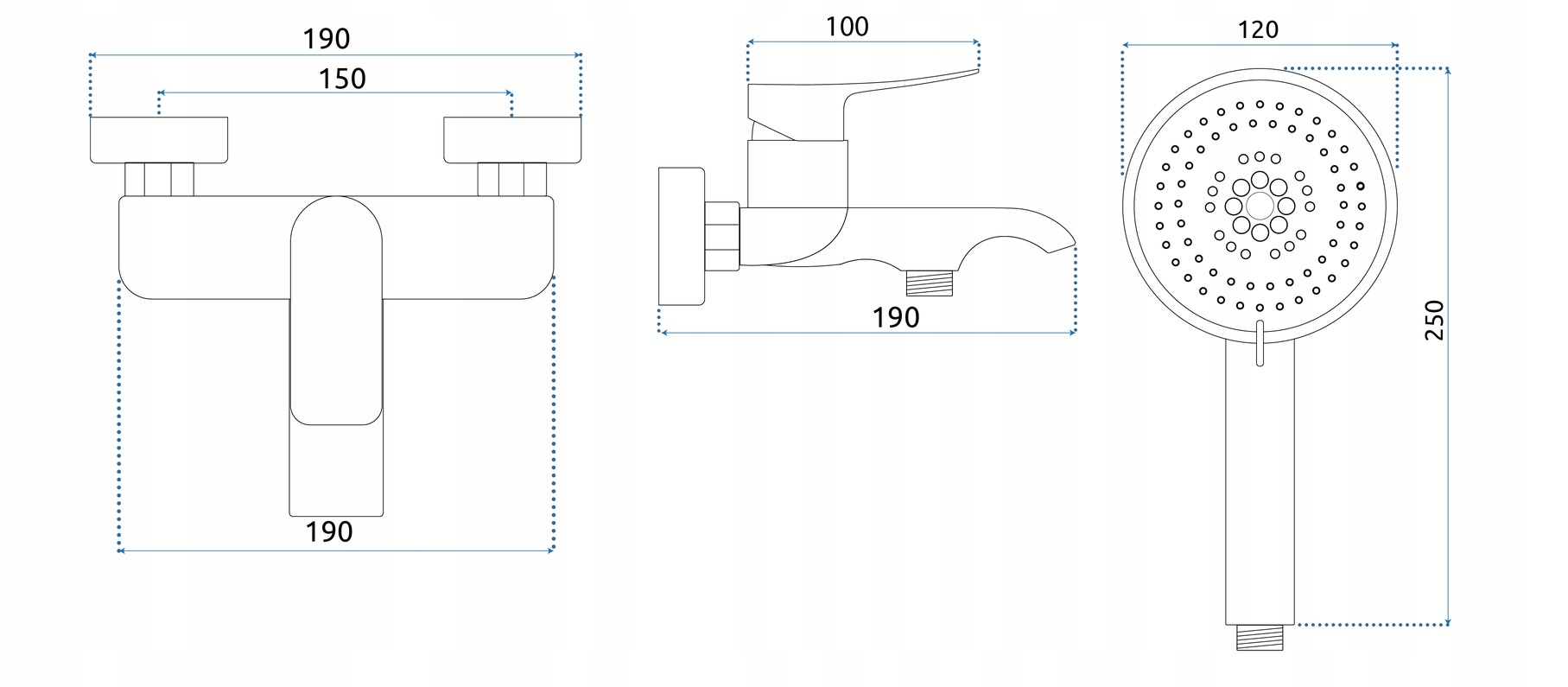 - Zawartość zestawu: wylewka, bateria, wąż prysznicowy, słuchawka prysznicowa, mocowanie ścienne słuchawki