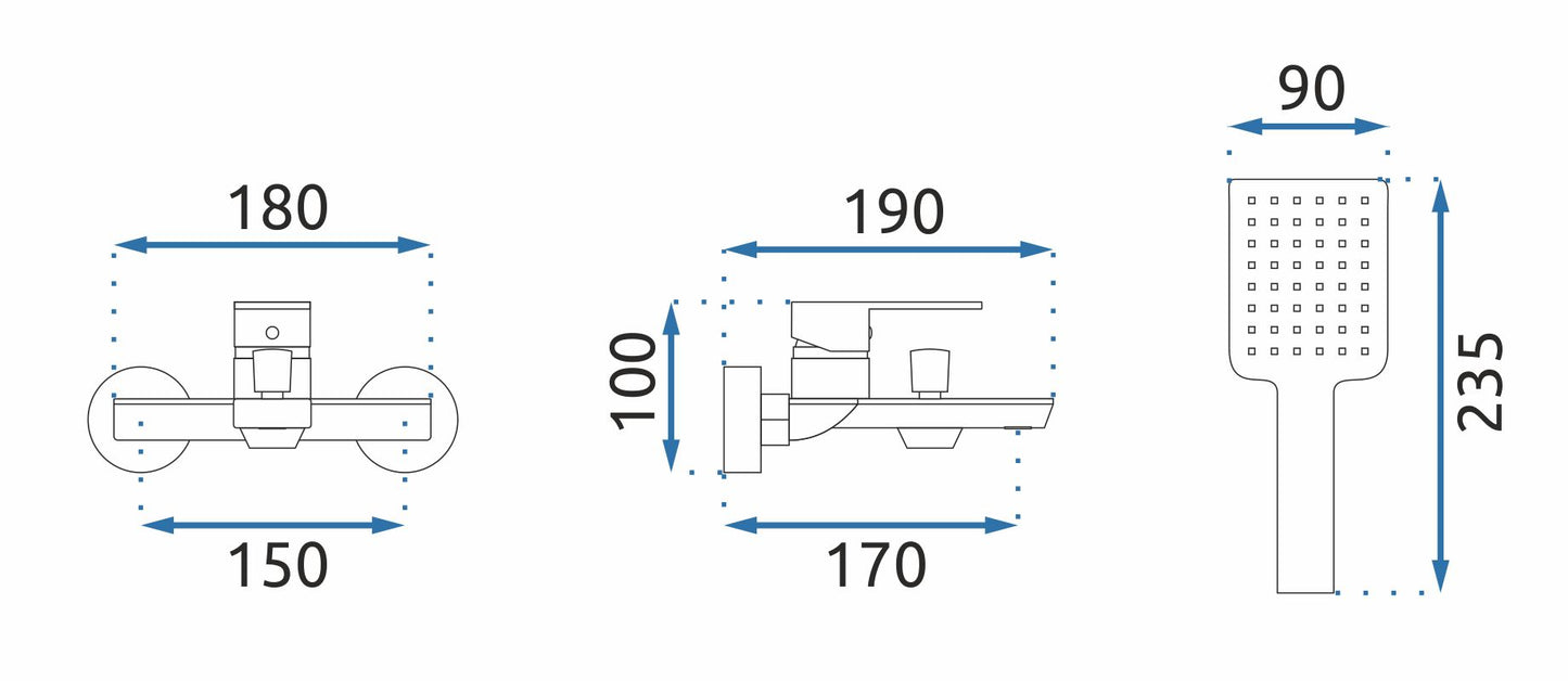 - Zawartość zestawu: wylewka, bateria, wąż prysznicowy, słuchawka prysznicowa, mocowanie ścienne słuchawki