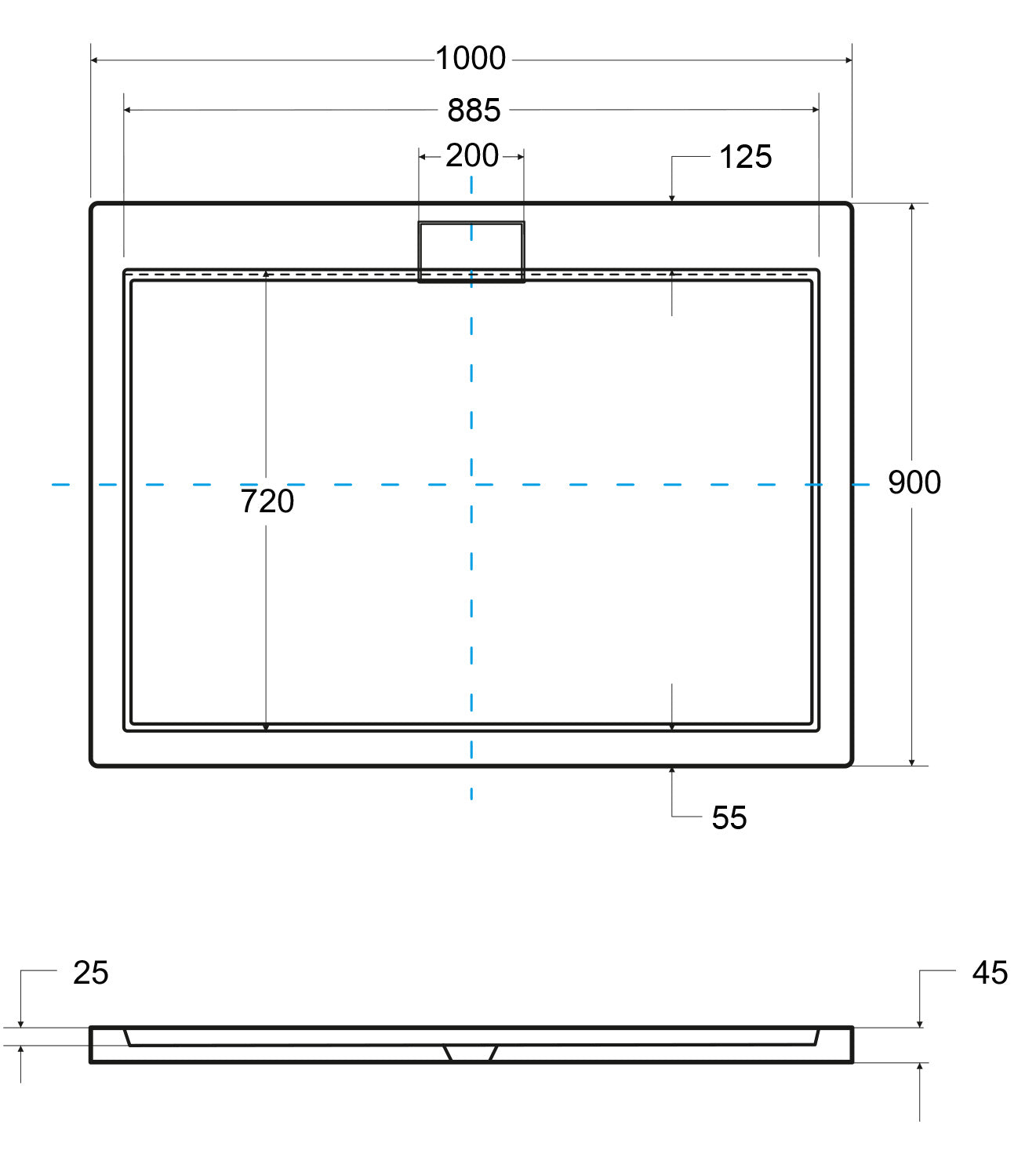 - Umiejscowienie odpływu: na środku szerszej krawędzi, 50 mm