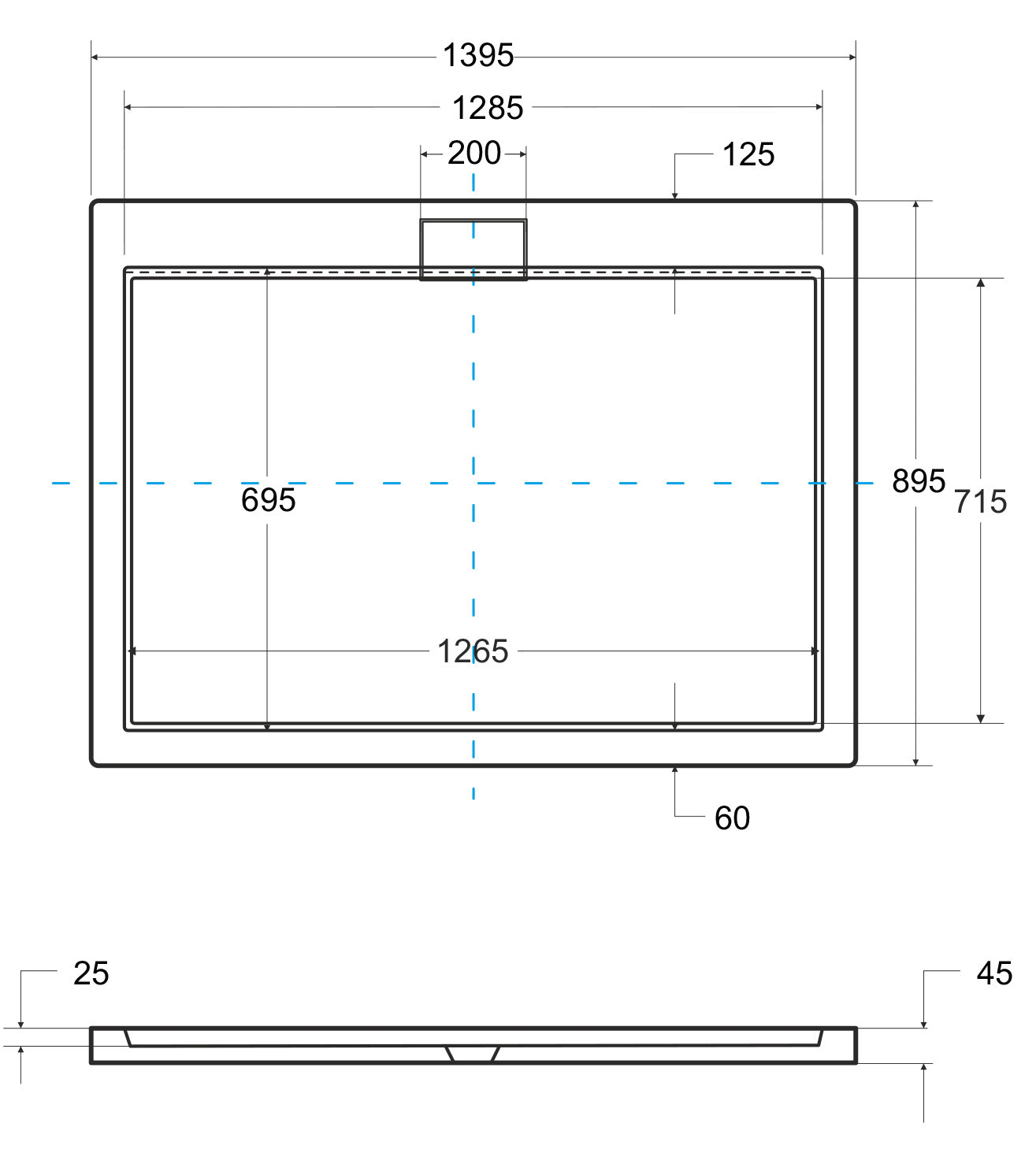 - Umiejscowienie odpływu: na środku szerszej krawędzi, 50 mm