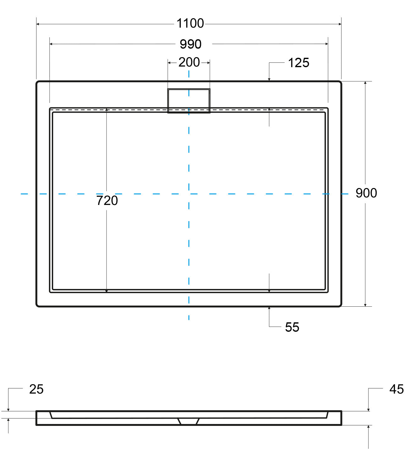 - Umiejscowienie odpływu: na środku szerszej krawędzi, 50 mm