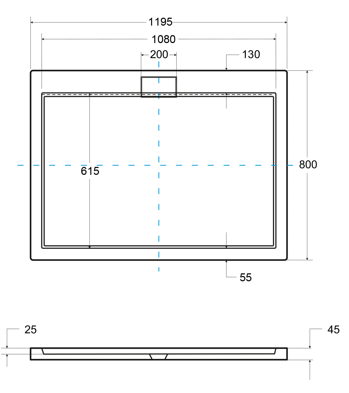 - Umiejscowienie odpływu: na środku szerszej krawędzi, 50 mm