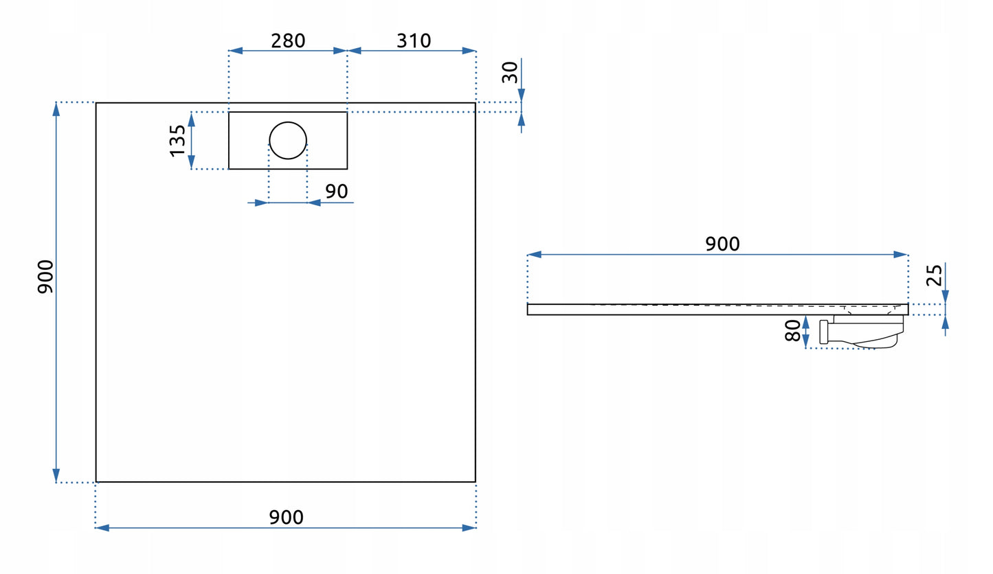 - Umiejscowienie odpływu: na środku przy krótszej krawędzi, kratka maskująca o strukturze i w kolorze brodzika, 90 mm