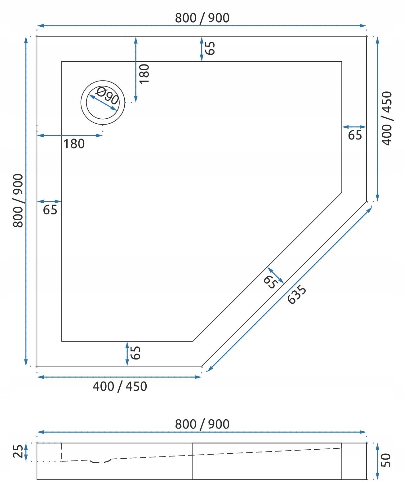 - Umiejscowienie odpływu: w rogu