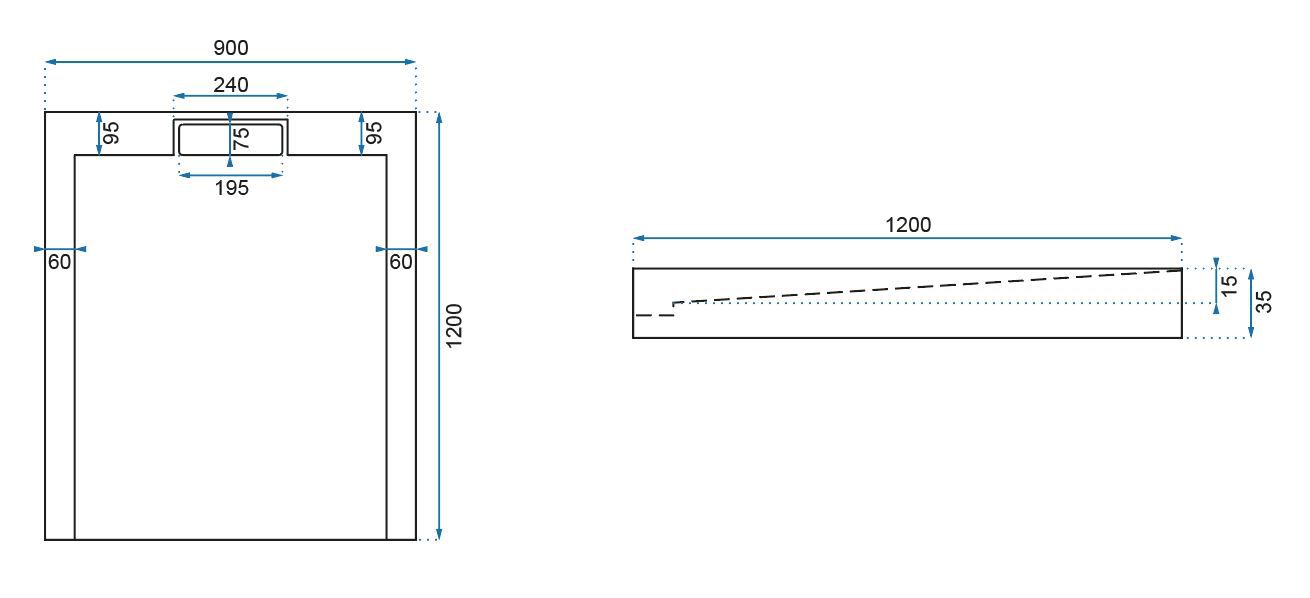 - Umiejscowienie odpływu: na środku krótszego boku