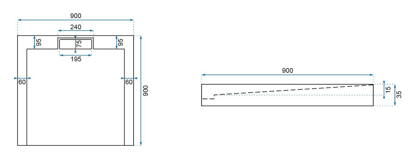 - Umiejscowienie odpływu: na środku krótszego boku