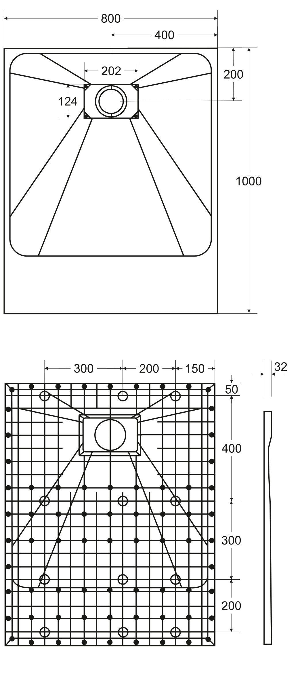 - Umiejscowienie odpływu: na środku przy krótszej krawędzi, kratka maskująca o strukturze i w kolorze brodzika, 90 mm