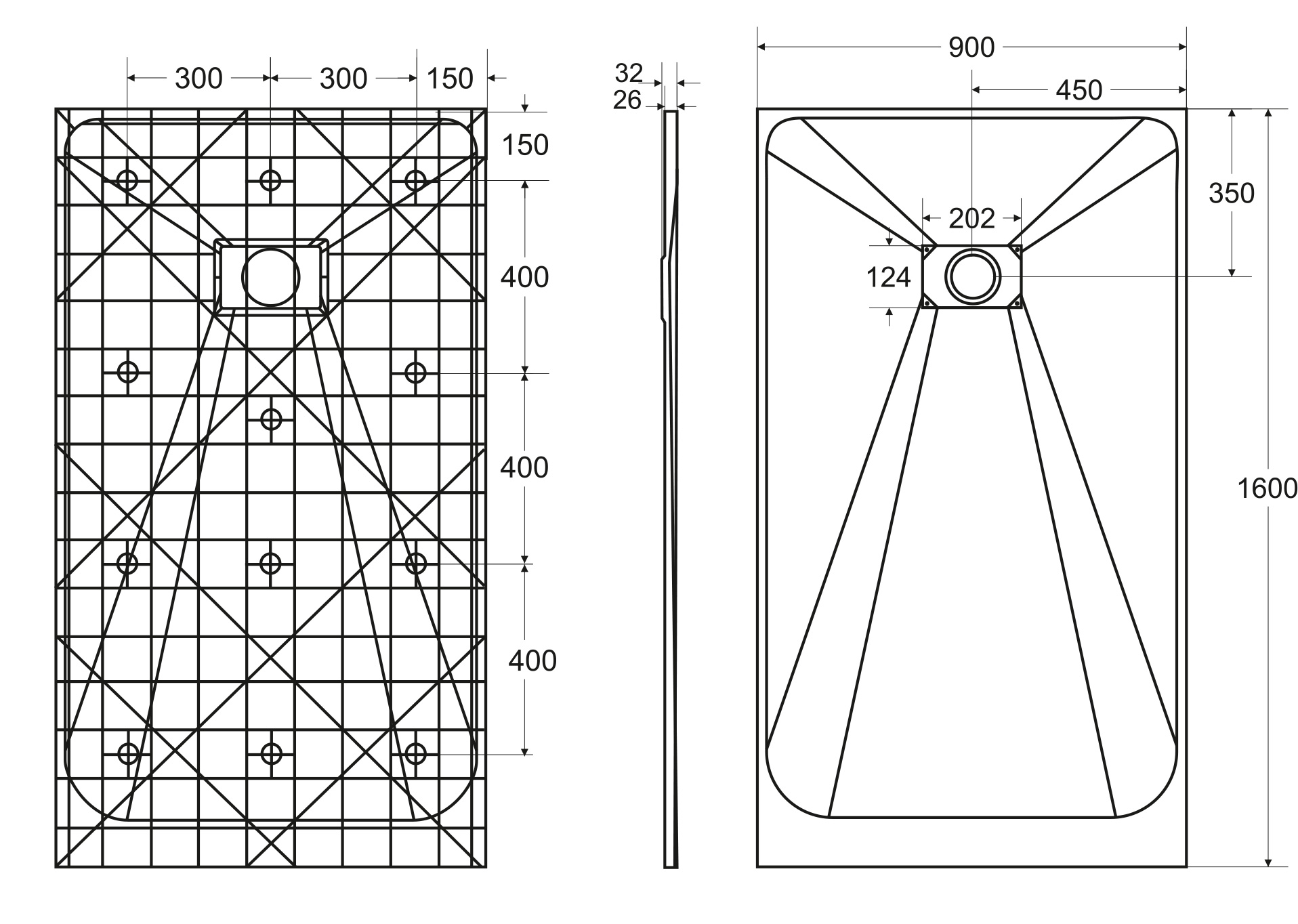 - Umiejscowienie odpływu: na środku przy krótszej krawędzi, kratka maskująca o strukturze i w kolorze brodzika, 90 mm