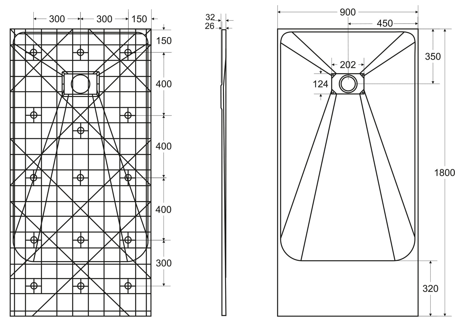 - Umiejscowienie odpływu: na środku przy krótszej krawędzi, kratka maskująca o strukturze i w kolorze brodzika, 90 mm