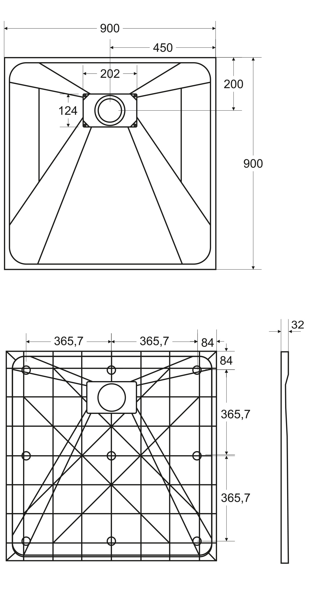 - Umiejscowienie odpływu: na środku przy krótszej krawędzi, kratka maskująca o strukturze i w kolorze brodzika, 90 mm