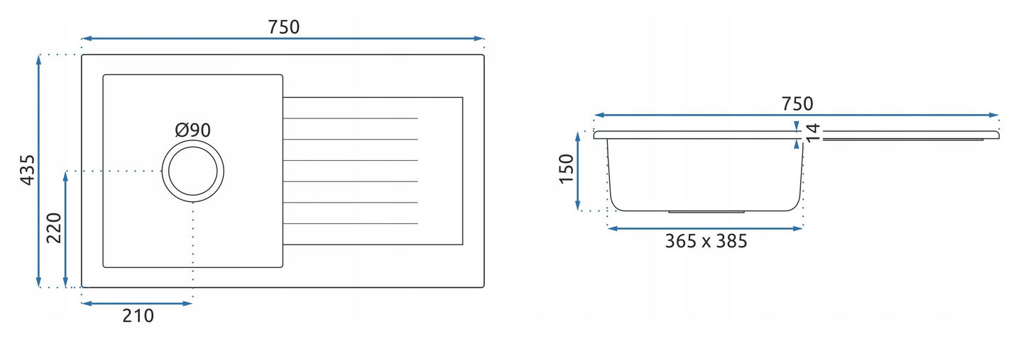 - Długość zlewozmywaka (mm): 750 mm