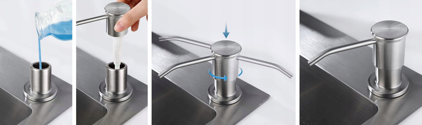 - W komplecie ze zlewozmywakiem: uszczelka, syfon z sitkiem, zaczepy mocujące, bateria kuchenna, dozownik do płynu do naczyń 360 ml