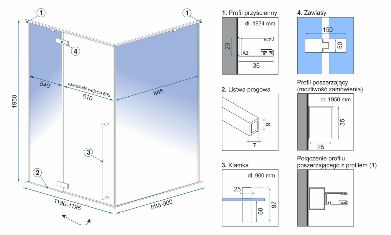 - Regulacja na profilach: 118-119,5 cm (strona drzwiowa) 88,5-90 cm (strona stała)