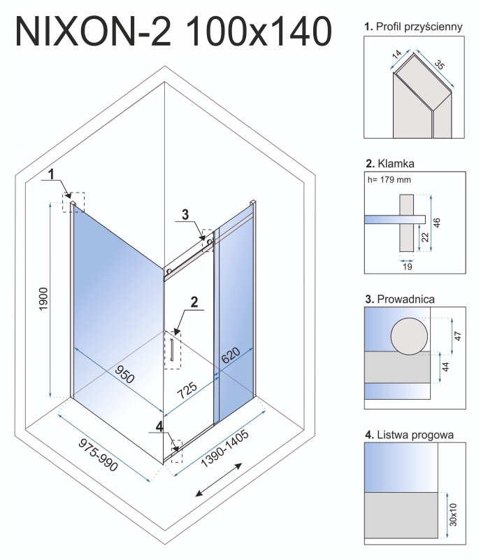 Kabina NIXON 140x100 P prysznicowa narożna suwana