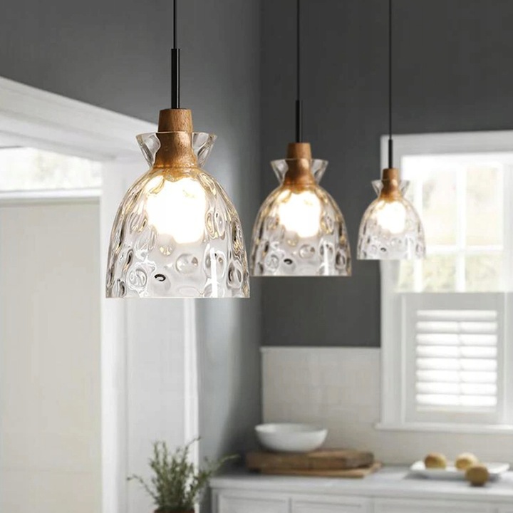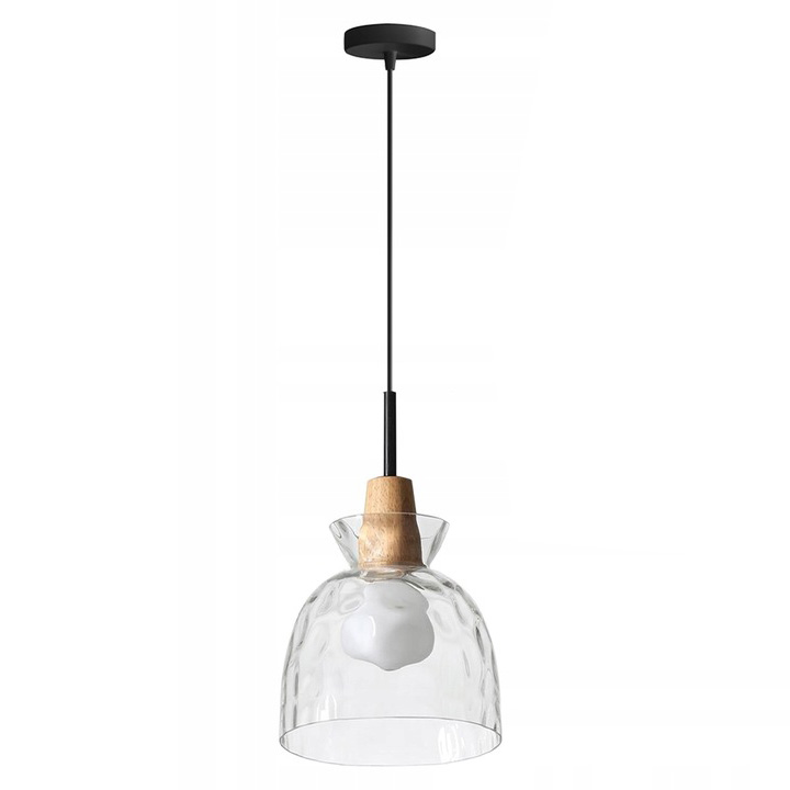 Lampa została wykonana z pięknego szkła w połączeniu z drewnem oraz z metalową maskownica przy suficie. Wyjątkowy kształt doskonale sprawdzi się w każdym pomieszczeniu niezależnie od stylu jego wykończenia. Lampa do samodzielnego montażu. Długość kabla można dopasować odpowiednio do pomieszczenia lub aranżacji.