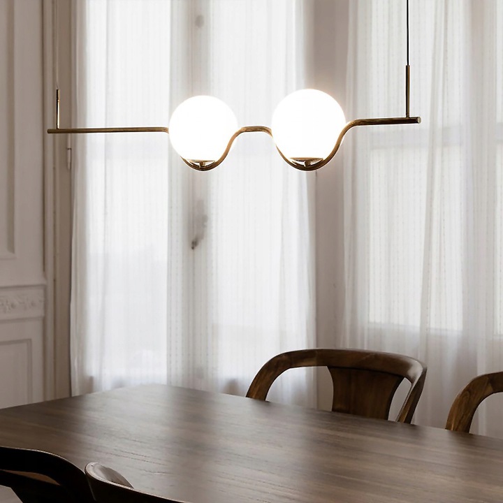 Prezentowana lampa to z pewnością odważny wybór – nie trudno zauważyć, że nasz produkt od razu zwraca na siebie uwagę. Lampa wykonana jest głównie z szkła z metalowym korpusem i maskownicą w kolorze złotym. Długość kabla można dopasować odpowiednio do pomieszczenia bądź aranżacji – wszystko zależy od Państwa wyobraźni.