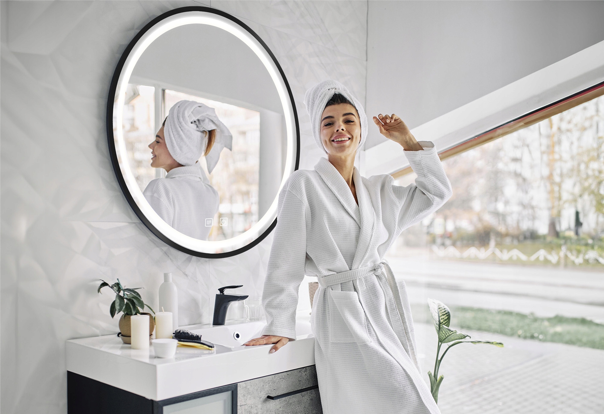 Nowoczesne lustro łazienkowe podświetlane w czarnej ramie z funkcją zmiany barwy światła. Okrągłe lustro z podświetleniem Led to idealna propozycja dla tych którzy cenią sobie wygodę użytkowania oraz nowoczesny design. Lustro jest wykonane z najwyższej jakości materiałów, idealnie się prezentuje oraz jest bardzo wytrzymałe.