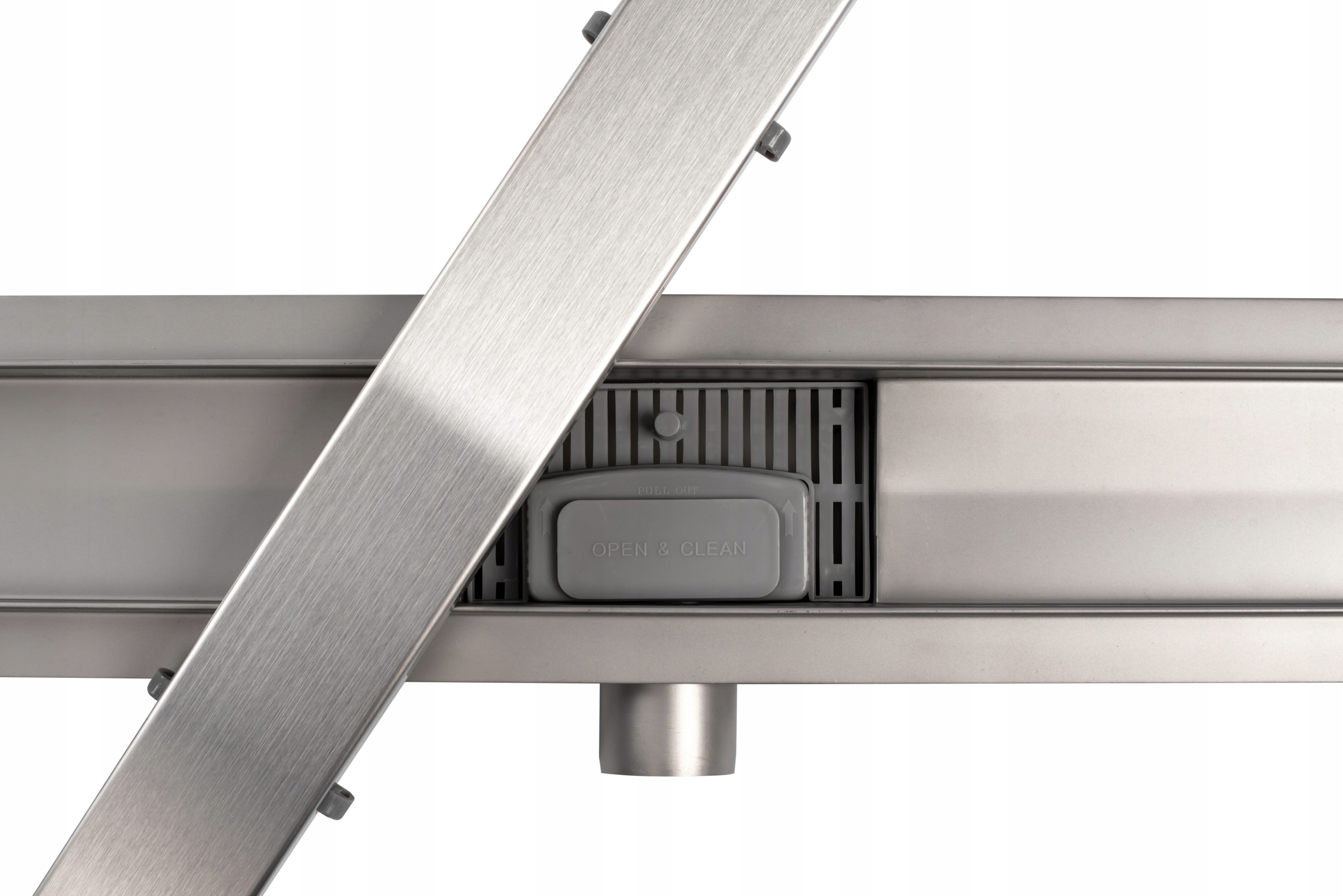 Maskownica w odpływie jest obustronna, dzięki czemu możemy wybrać dwie wersje wykończenia – szczotkowana stal lub wklejona płytka, co sprawia że dopasujemy rodzaj wykończenia do każdej łazienki.