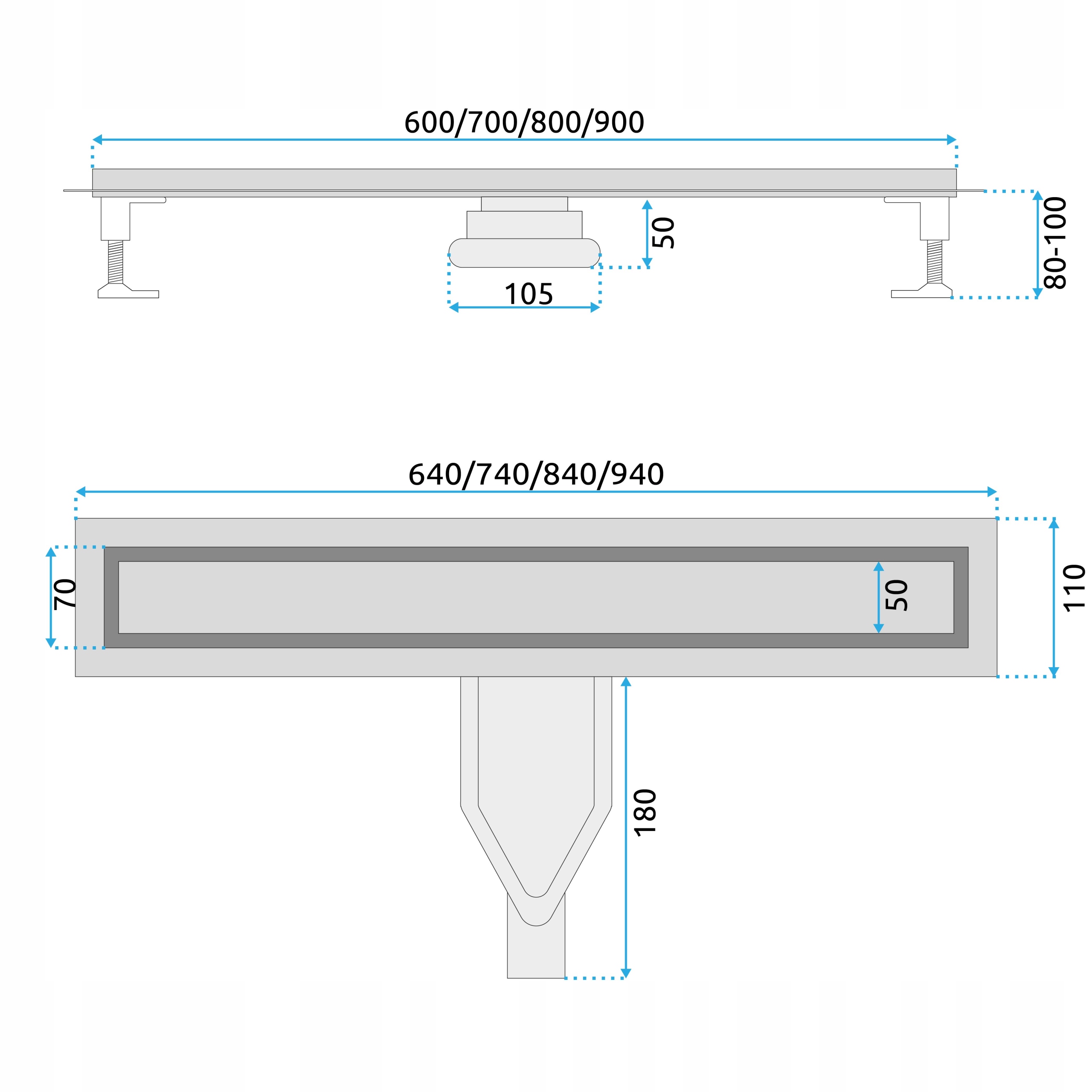 Zastosowane nóżki dają możliwość pełnej regulacji wysokości odpływu do potrzeb i możliwości montażu. Minimalny zakres regulacji to 52 mm a maksymalny 68 mm. Niski profil wynoszący 52 mm to aktualnie najniższy na rynku dostępny odpływ liniowy.