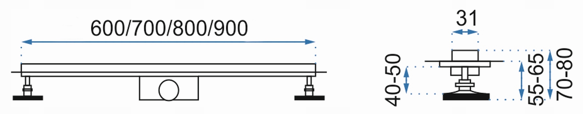 Zastosowane nóżki, dają możliwość pełnej regulacji wysokości odpływu do potrzeb i możliwości montażu. Minimalny zakres regulacji to 70 mm a maksymalny 80 mm. Istnieje możliwość całkowitego demontażu nóżek w celu dostosowania odpływu do warunków montażowych.