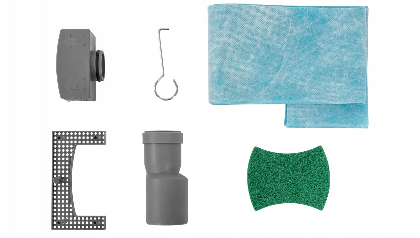 - W komplecie: maskownica, syfon, kołnierz uszczelniający, nóżki poziomujące, plastikowe stabilizatory rusztu