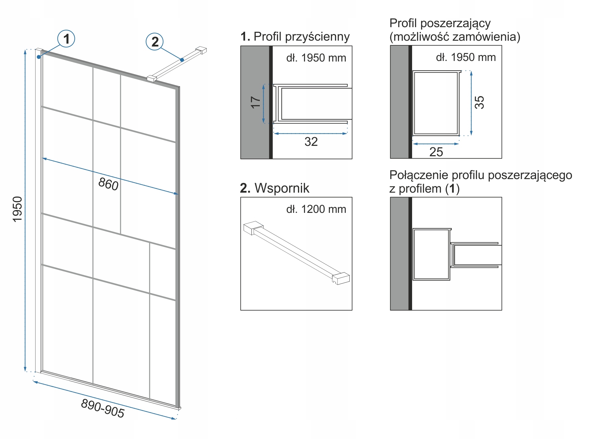 - Profil przyścienny: 1,7x3,2 cm
