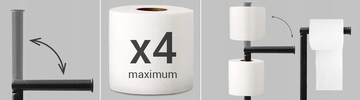 - W zestawie: uchwyt na papier toaletowy, miejsce na zapas papieru (max. 4 rolki), podstawa z antypoślizgowymi stopkami, elementy montażowe