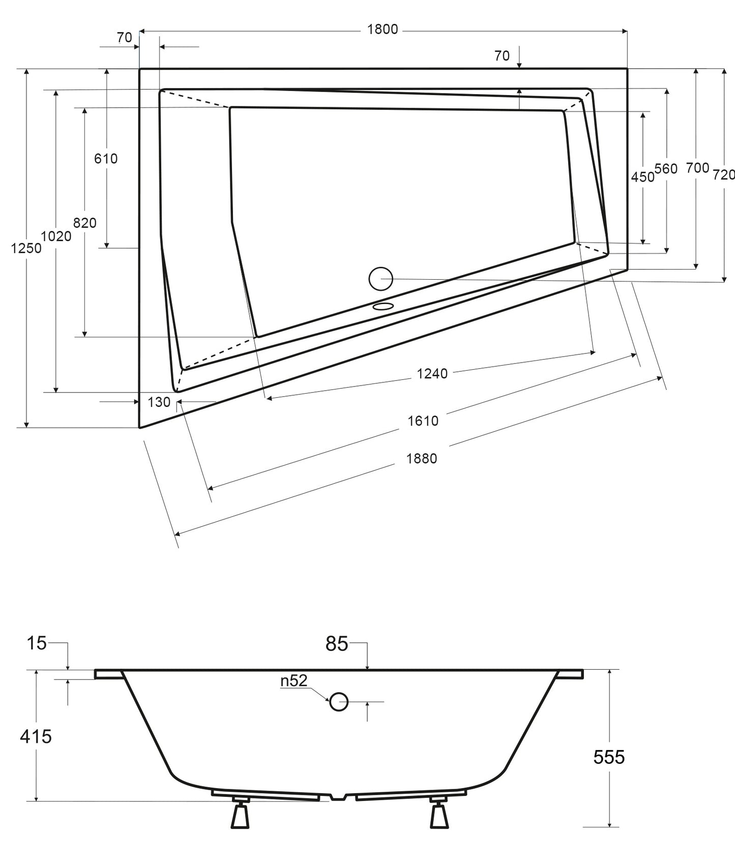 - Typ wanny: pod zabudowę, asymetryczna