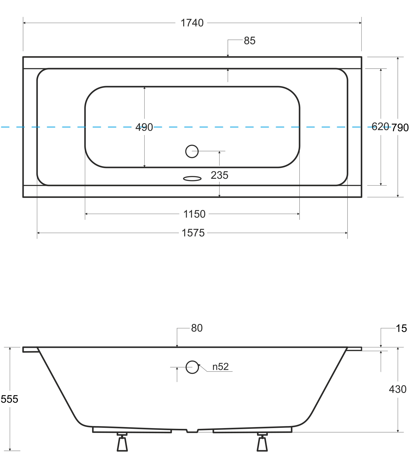 - Typ wanny: pod zabudowę, prostokątna