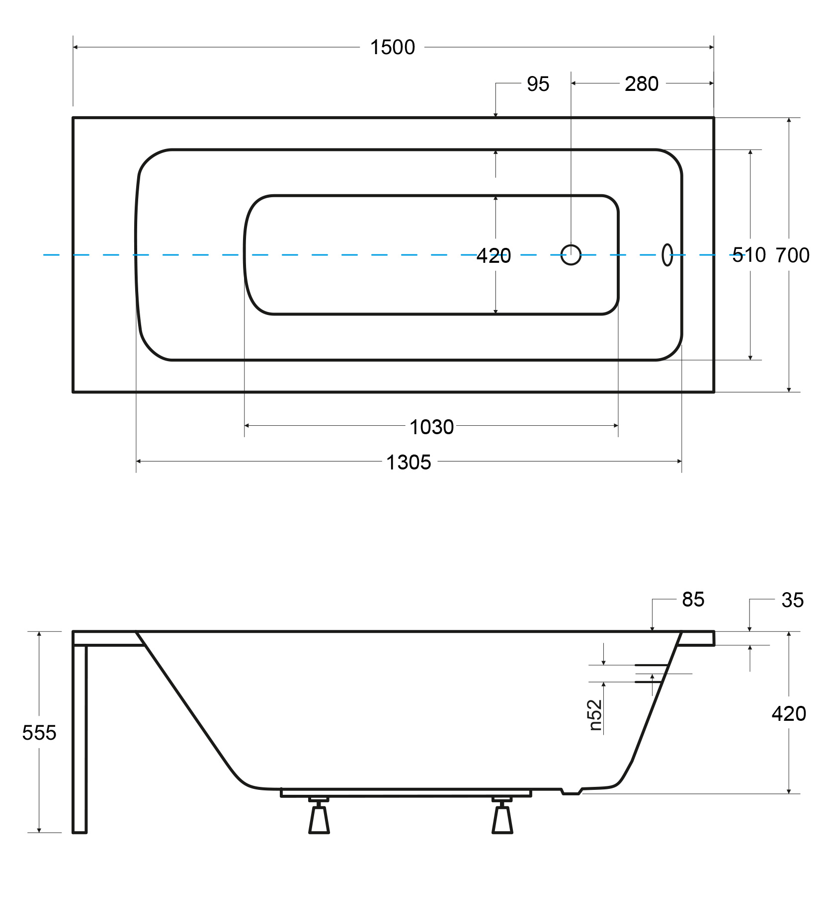 - Typ wanny: pod zabudowę, prostokątna