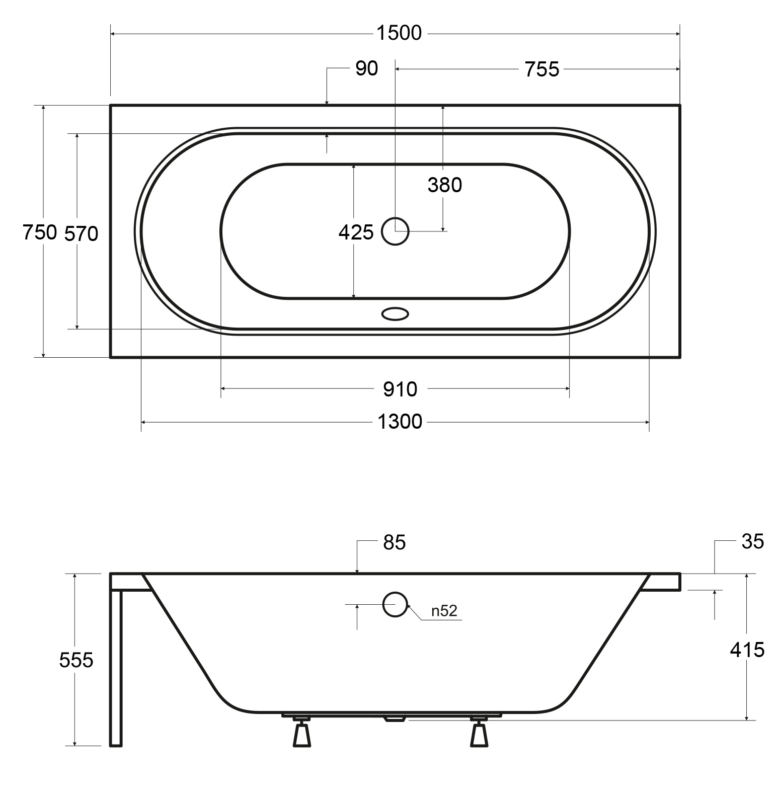 - Typ wanny: pod zabudowę, prostokątna