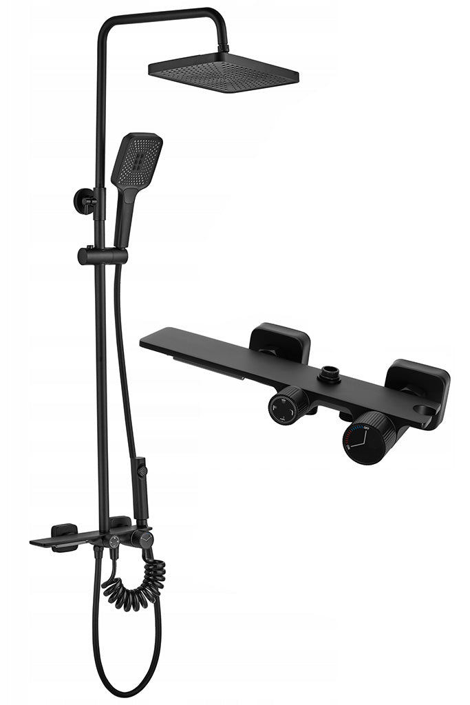 - W zestawie: ręczny zestaw natryskowy (bidetta), wylewka, wąż prysznicowy ze słuchawką, deszczownica, uchwyt do słuchawki