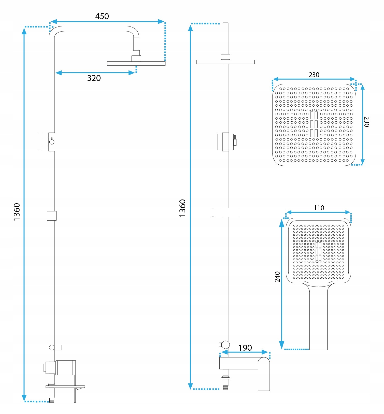 - W zestawie: wylewka dolna, słuchawka ABS, złącze kulowe umożliwiające dowolne ustawienie deszczownicy