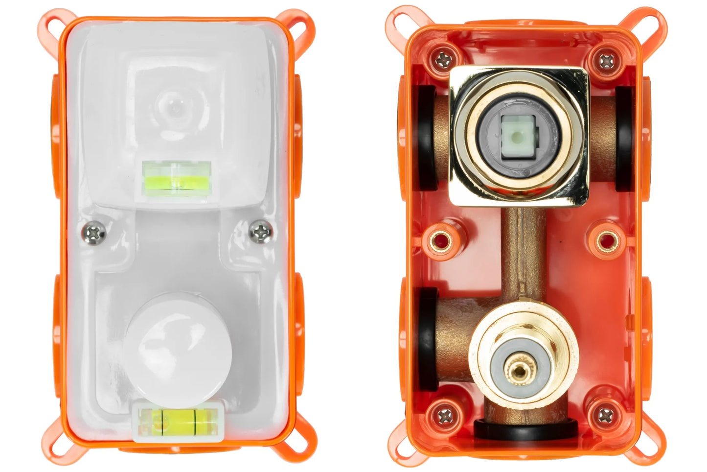 służący do instalacji baterii podtynkowej. System zapewnia wygodny i szybki montaż. Wykonany został z tworzywa sztucznego, oraz mosiężnych elementów wewnętrznych, co gwarantuje wysoką jakość i niezawodność. Element wyposażony został w część maskującą, zabezpieczającą wewnętrzne elementy podczas montażu, oraz poziomicę ułatwiającą prawidłowy i precyzyjny montaż. System umożliwia łatwy dostęp do wewnętrznych elementów baterii po zamontowaniu w celu konserwacji.